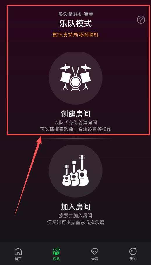3、最有特色的是乐队联机功能,在“乐队”页,队长可以创建房间选歌,队员在同一个局域网下搜索加入,就能实现多设备共同演奏。