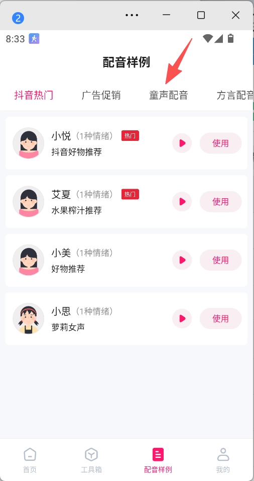 3、打开“配音样例”、能选择抖音热门、广告促销、童声配音等不同类别的配音样例。