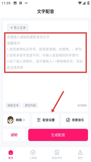 1、在首页输入或粘贴需要配音的文字内容,挑选合适的配音人员并完成配音相关设置,随后点击“生成配音”按钮。