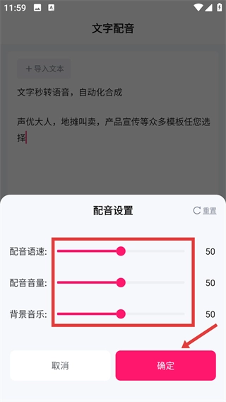 2、点击【配音设置】,调节语速、音量等参数后点确定呀。