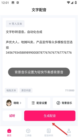 4、设置完成后,点击【生成配音】完成文字转语音啦。