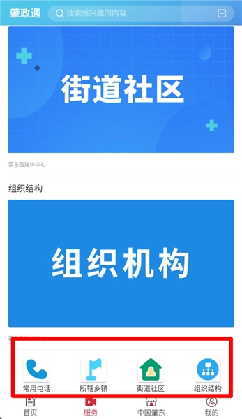 2、便民服务:进入服务栏目,获取常用电话与街道社区信息。
