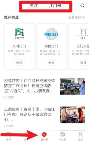 2、点击江门号板块可浏览本地各类政务、文旅、网信等账号并一键关注掌握更新内容。