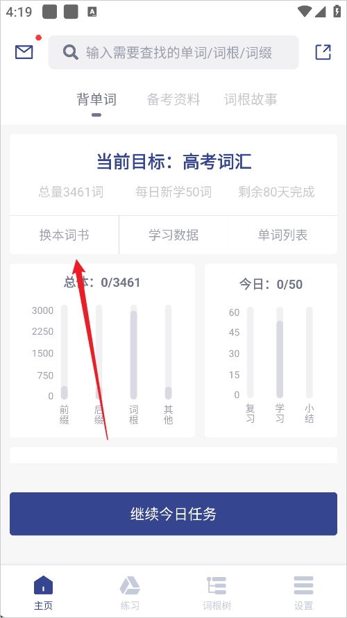 1、在首页的上方位置选择“换本词书”选项