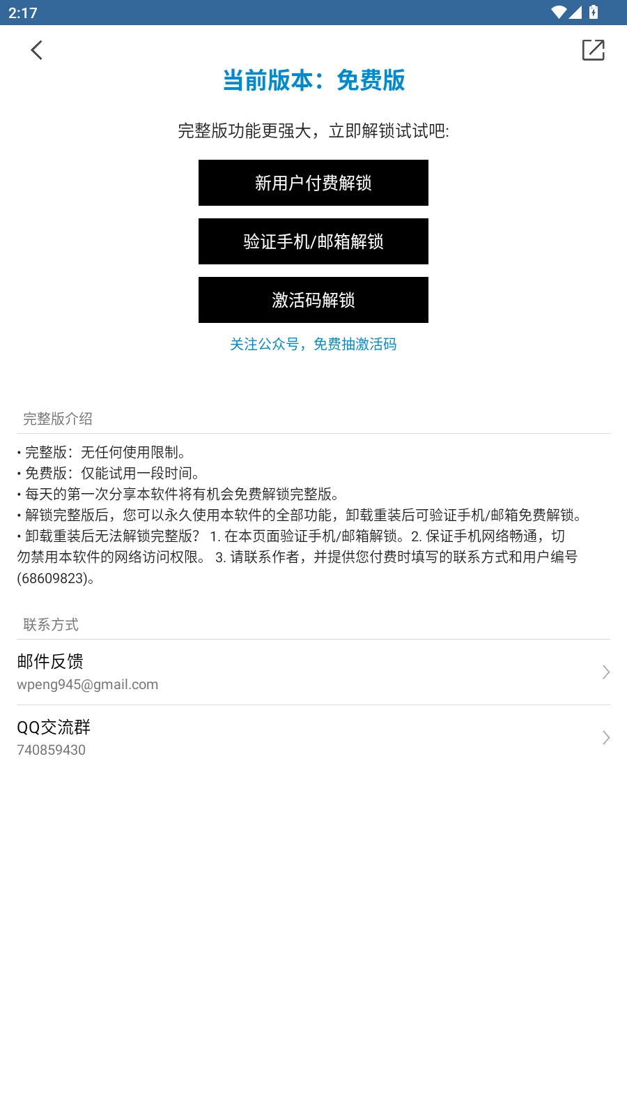 3、右上角的设置里点开“关于”,可以在这里对作者进行赞助解锁软件的永久使用功能。