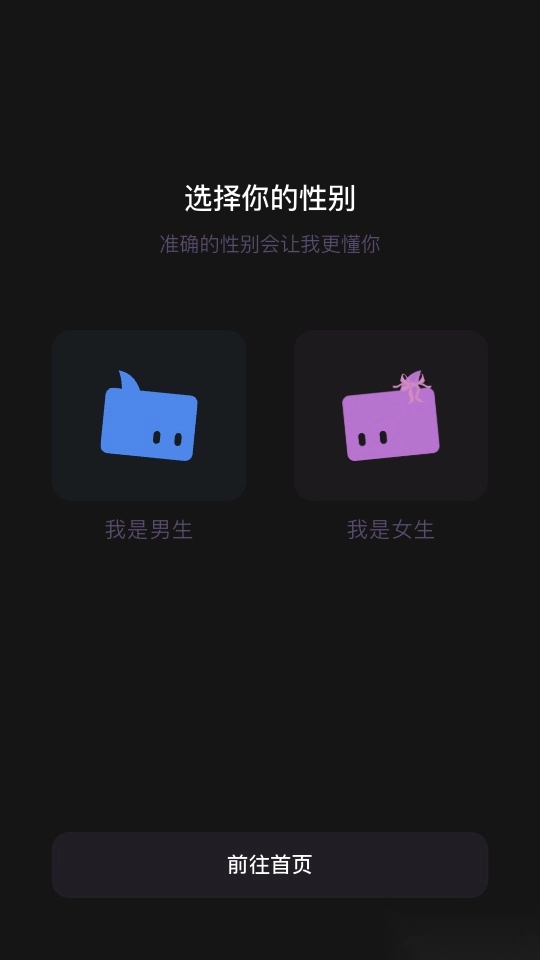 5、进入选择性别界面来选择自己的性别,点击“前往首页”按钮进行下一步操作。
