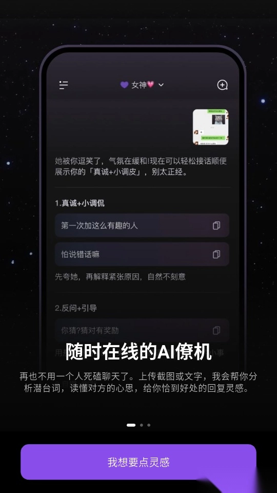 软件为用户提供了线上的AI聊天辅助,进而可以有效实现聊天互动,掌握多种对话技巧。