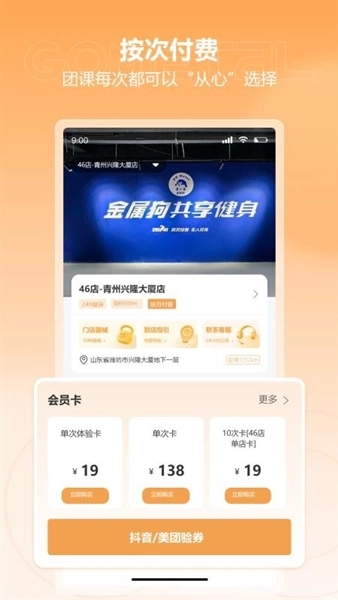 可以通过软件直接购买健身卡,这样就可以直接出示健身卡二维码轻松扫码进入健身场馆;