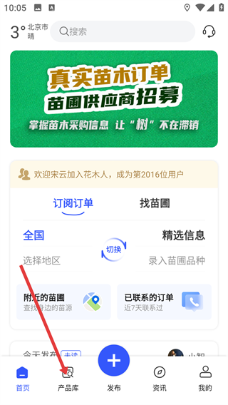 1、进入花木人首页后,找到底部导航栏中的【产品库】选项并点击,即可进入园林植物相关的分类页面。