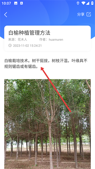4、在【白榆种植管理方法】详情页,查看白榆的栽培特性、种植管理要点等信息,辅助相关种植工作。
