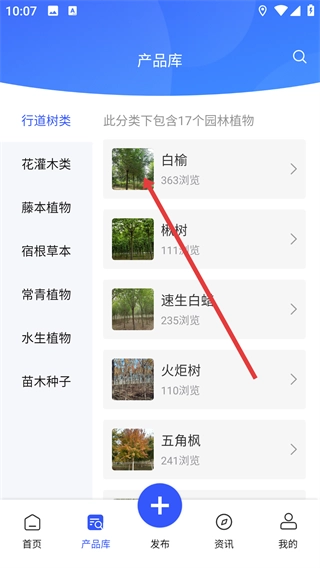2、在产品库页面的【行道树类】下,选择【白榆】选项,进入该植物对应的详情分类页面。