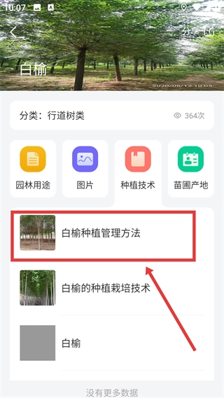 3、在白榆的分类页面中,点击【白榆种植管理方法】选项,查看该植物的种植管理相关内容。
