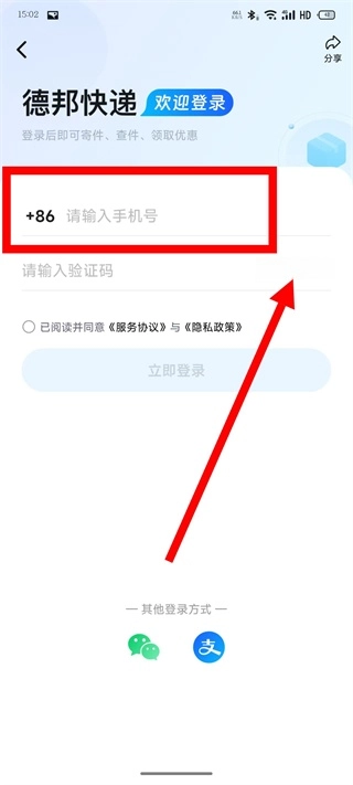3、在登录页面,输入手机号,点击获取验证码。