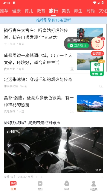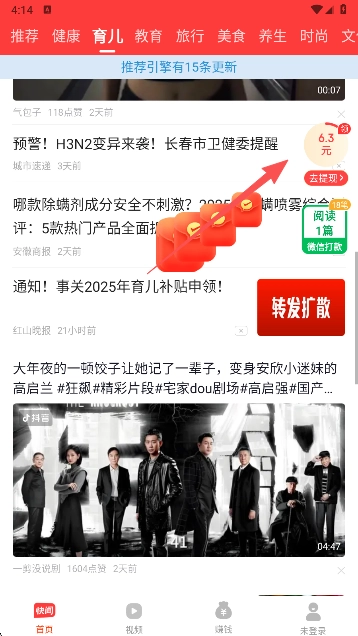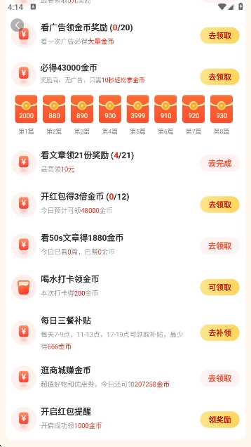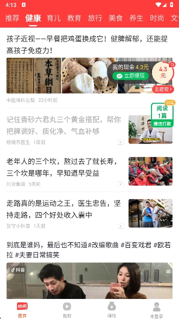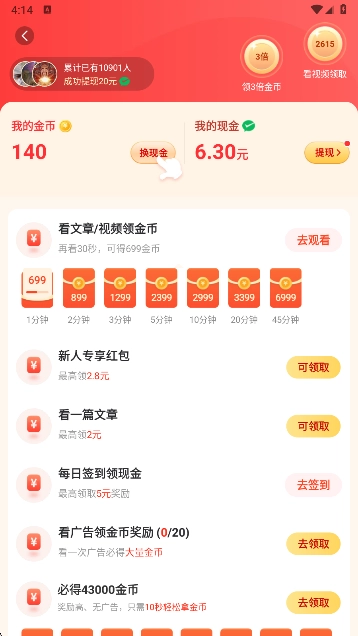 多重赚钱任务,收益看得见: 不止看资讯!签到领现金、阅读得金币、看视频领红包、做任务奖不停!多种赚钱方式,提现门槛低,收益实时到账!