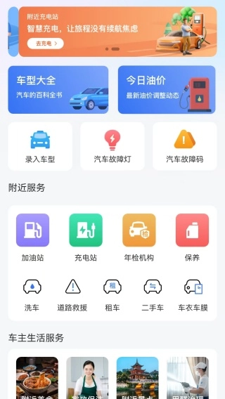 进入平台首页后,你可以看到车型大全、今日油价、附近充电站等各类信息。