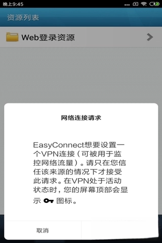 4、验证完成后会自动返回EasyConnect资源列表页面,并在状态栏会有VPN连接的状态显示。