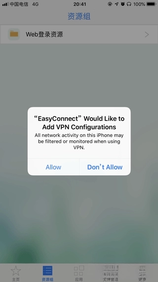 3、第一次登录VPN可能会弹出如下英文提示,选择“Allow”。随后会自动跳转至网络连接请求界面,点击“确定”完成验证。