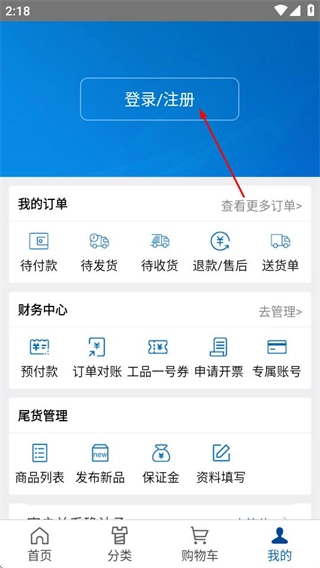 2、在个人中心页面,点击登录注册按钮,进入账户登录页面。