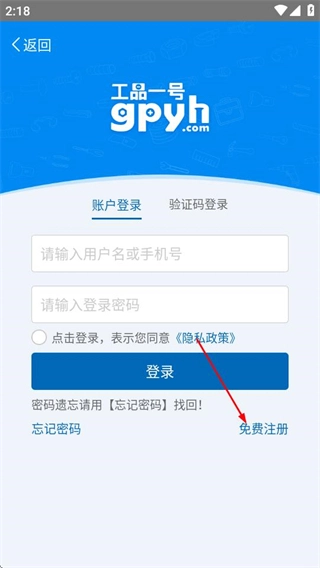 3、在登录页面,点击免费注册选项,进入注册工品账号页面。