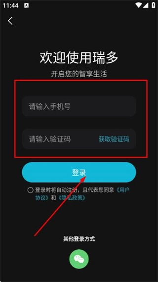 3、在登录页面填写手机号和验证码,勾选协议后,点击登录完成账号登录操作。