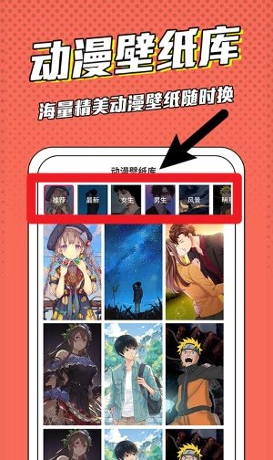 2、进入动漫壁纸库,点击上方分类标签即可浏览不同风格的动漫壁纸并自由选择更换喜欢的背景图。