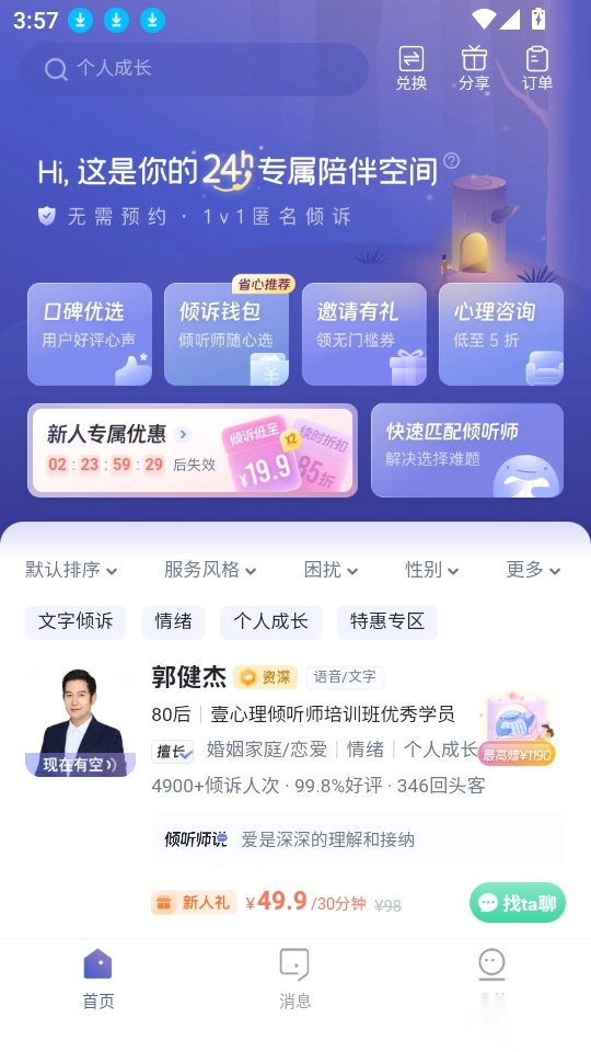 软件中汇集了海量的倾听师,这里更多的心理倾听师都可选择,满足不同用户的倾听需求。