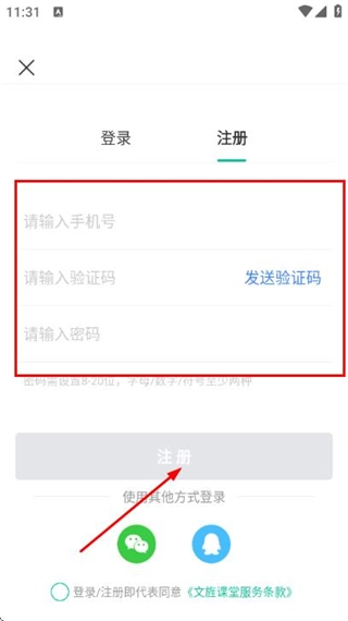 4、在注册页面填写手机号、验证码、密码,勾选同意协议后点击注册完成账号注册操作。