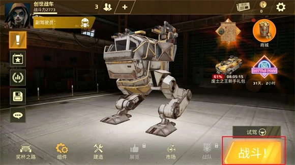 1、在创世战车移动版中,有一个与端游类似的高亮战斗按钮和一个试驾按钮。点击试驾按钮就可以在车库中对你的战车进行测试驾驶,而点击战斗按钮则会先进入模式的选择界面。