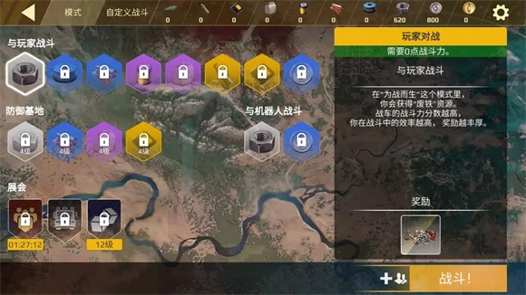 2、如图所示,战斗选择界面主要分为三大板块:与玩家战斗、防御基地、与机器人战斗,还有乱斗模式的“展会”。一般来说,“防御基地”类似于我们传统认知里的PvE,即定时刷新敌人,守护目标点。