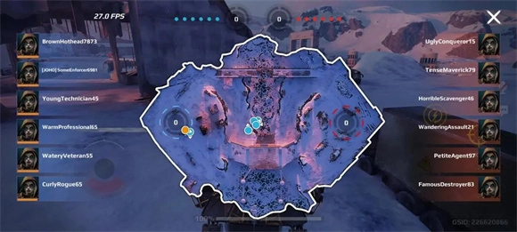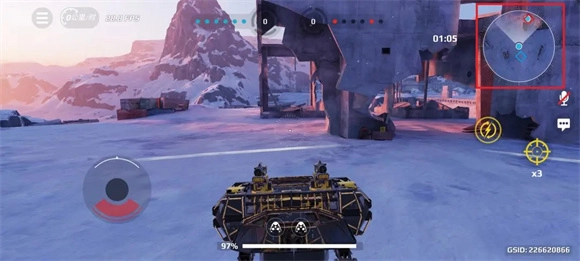 5、战场地图中会标注有基地的位置,分别用蓝色和红色的圆点标注队友和敌方战车的位置,黄色圆点则是自身的位置。