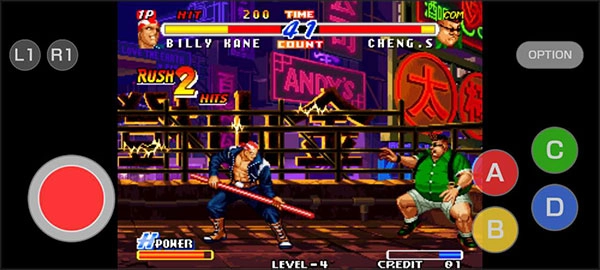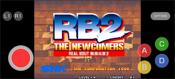 1、首先安装好饿狼传说2,点击左上角的L1进行投币,点击右边的A按键进入游戏。