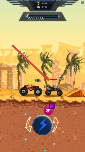 1、开局操控赛车处在赛场的9th,可以点击底部闪电按钮触发加速,尝试超越前方黑色卡车8th。