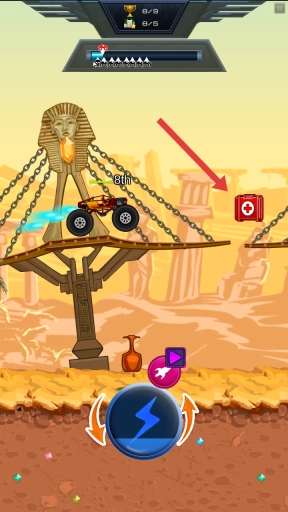 2、行驶至Sphinx雕像旁的红色急救箱区域,优先收集道具恢复车辆的血量,来提升自身的续航能力。