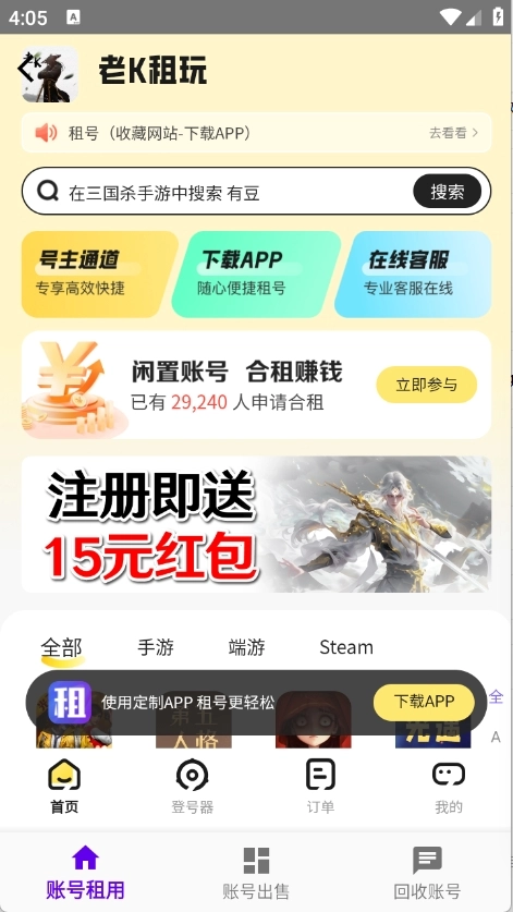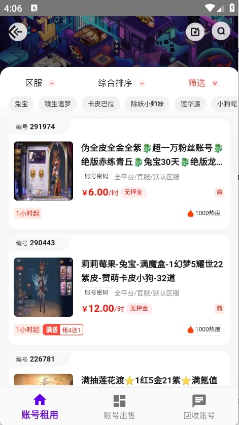 4、软件提供了租号服务,用户可随时在线租号,快速体验各样优质账号。
