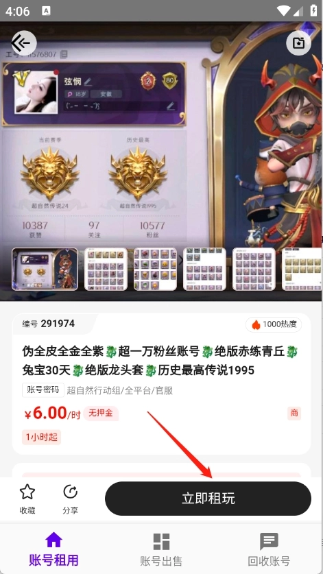 5、选择需要的账号进入到详情页点击“立即租玩”。