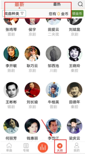 6、向用户推荐最热门的大师,直接选择大师就能够直接查看大师的戏曲;