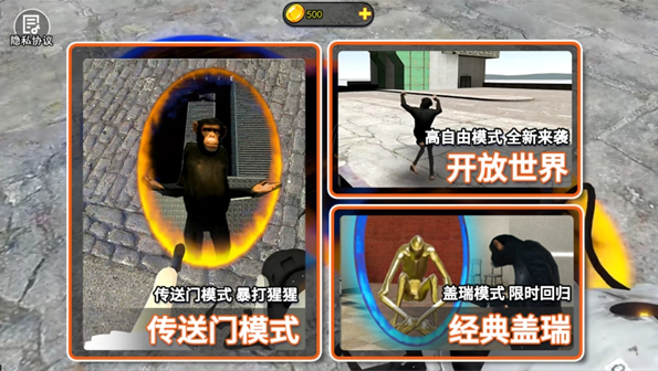 1、打开游戏界面后,按照屏幕上显示的闯关模式选择对应入口进行挑战:开放世界模式,高自由度玩法全新上线;传送门模式,在该模式下可与猩猩展开激烈对战;经典盖瑞模式,限时回归开启挑战。
