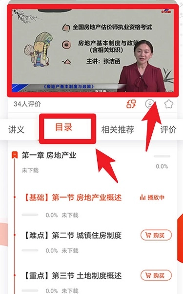 4、观看课程视频时可切换至“目录”查看章节安排,点击所需章节即可进入对应内容,支持基础、难点、重点分类学习。