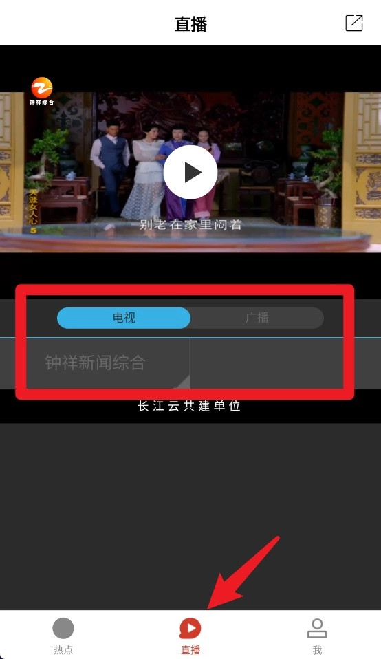 3、点击底部直播按钮,选择电视或广播即可观看钟祥本地电视节目或收听广播。