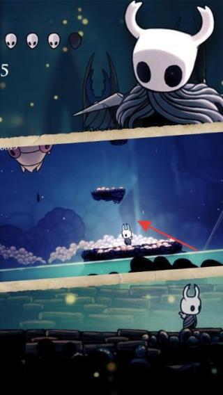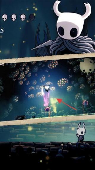 1、操控主角(小骑士),遇敌人(如上图怪物),点击攻击键(红箭头),用骨钉战斗。