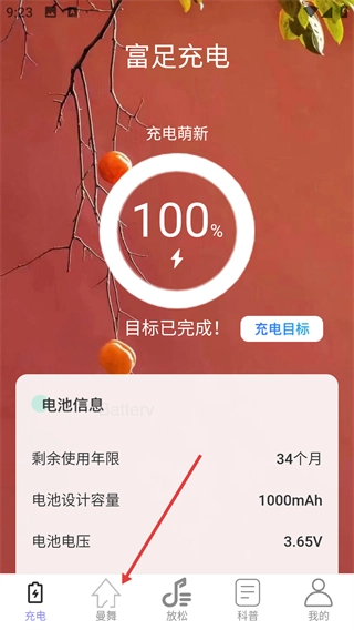 1、进入【富足充电】页面,可查看充电进度(当前显示为100%)以及电池相关信息,之后点击页面底部的【曼舞】选项,即可完成功能模块的切换。