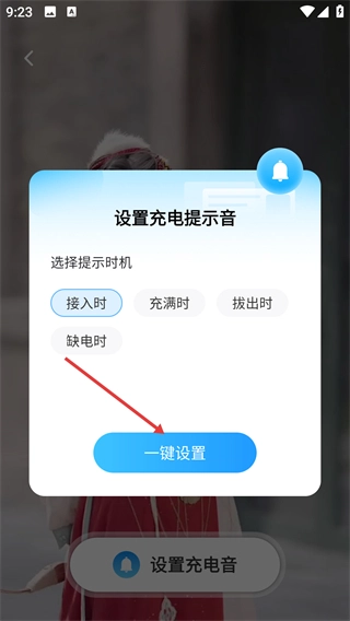 4、在【设置充电提示音】弹窗中选择提示时机(如“接入时”),点击【一键设置】完成充电音配置。