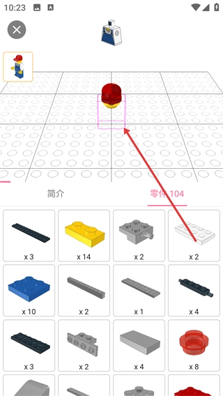 4、在虚拟拼搭页面,可选择零件(如红色零件)并放置到对应位置,完成拼搭步骤。