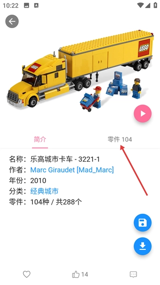 2、在作品详情页点击【零件104】标签,切换至该作品的零件清单展示界面。