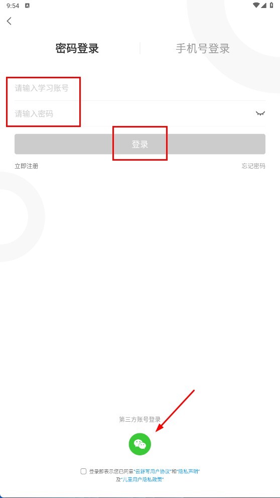 3.选择【密码登录】方式时,在输入框填写学习账号与密码,点击【登录】按钮完成登录;也可选择微信等第三方账号快捷登录。