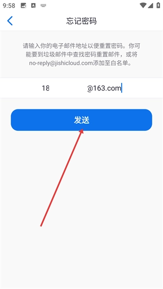4、在输入框中填写对应的电子邮箱地址后,点击【发送】按钮,触发密码重置邮件的发送。