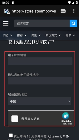 2、进入【创建您的账户】页面,需依次填写【电子邮件地址】并确认,选择【居住国家/地区】,完成【hCaptcha】验证。