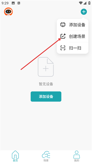 1、点击右上角的“+”按钮,待弹出菜单后选择【创建场景】选项,即可进入场景创建页面。