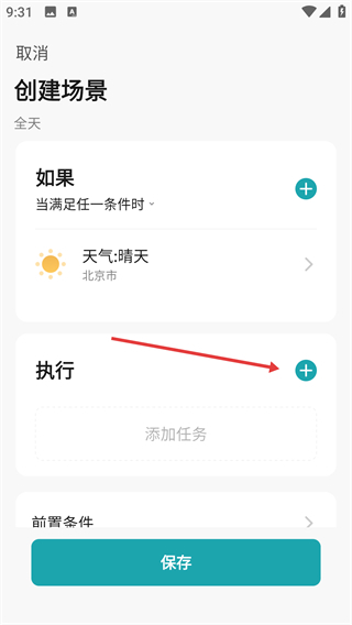 3、在场景配置界面设置“如果”条件(如天气:晴天),再点击“执行”区域的“+”按钮添加任务。