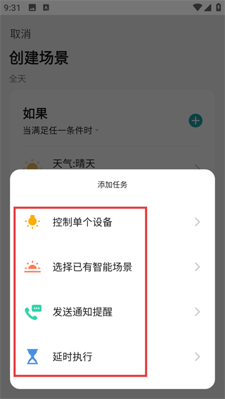 4、在“添加任务”弹窗中,可选择【控制单个设备】【发送通知提醒】等任务类型,完成任务配置。